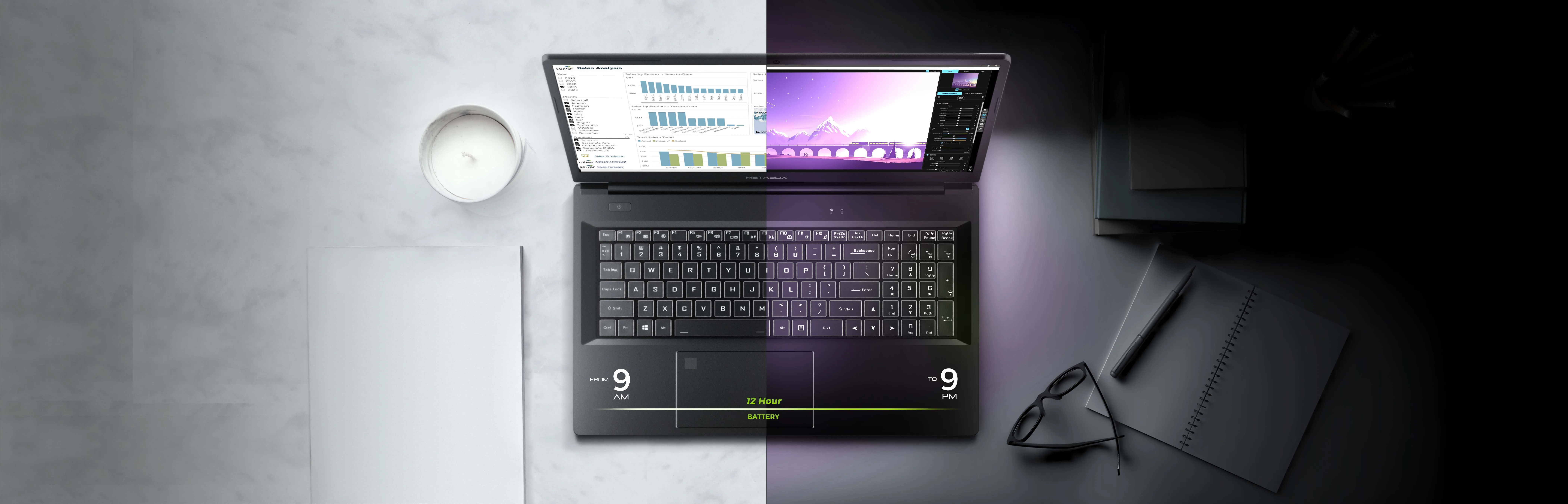 1. Battery life figures vary depending on Windows settings, method of use and hardware settings. Metabox test parameters included 35% Screen Brightness, keyboard Lighting Off, Windows Battery Saver Mode Active using MobileMark 2014. Hardware is configured with 8GB and 256GB M.2 SSD.