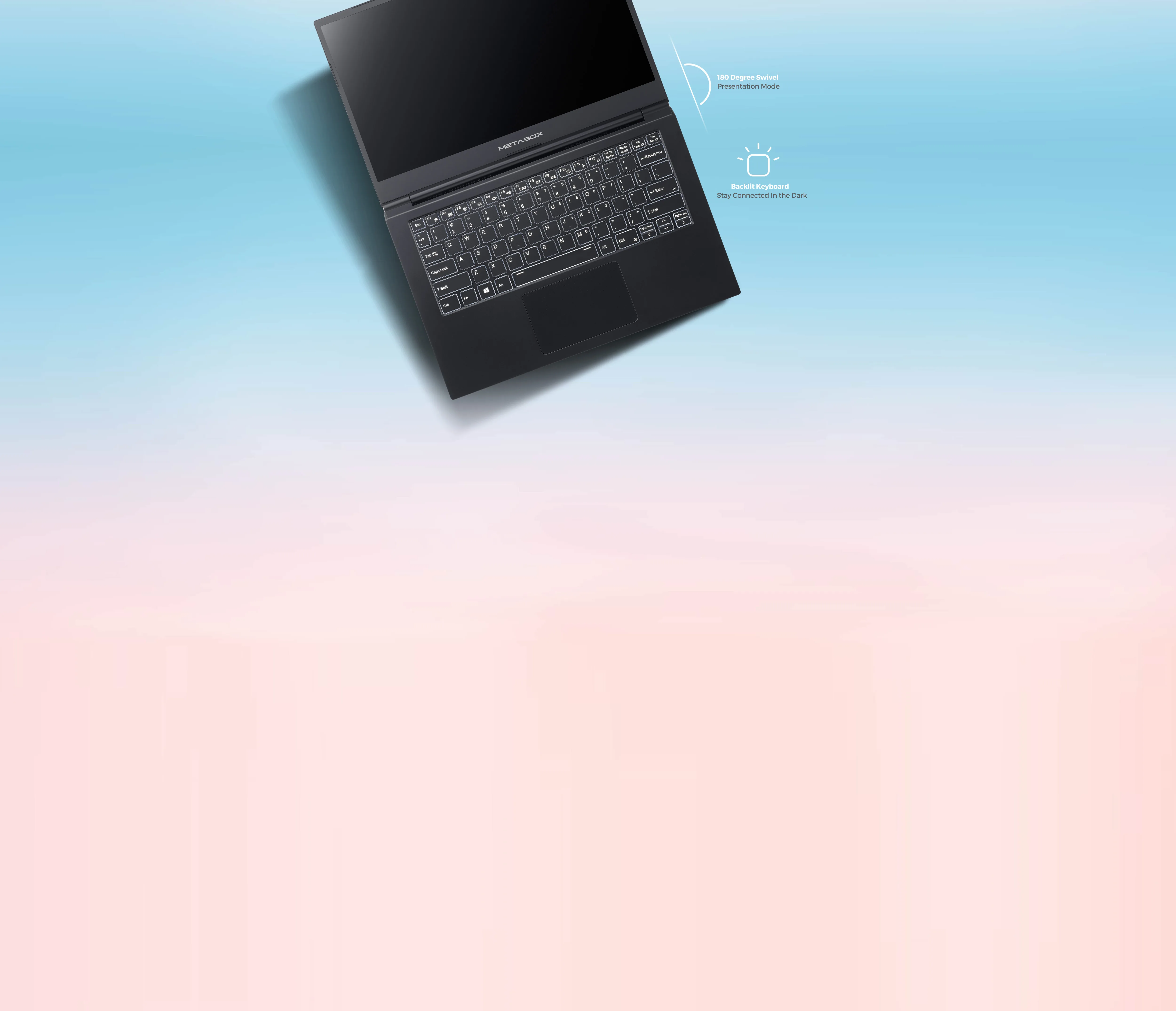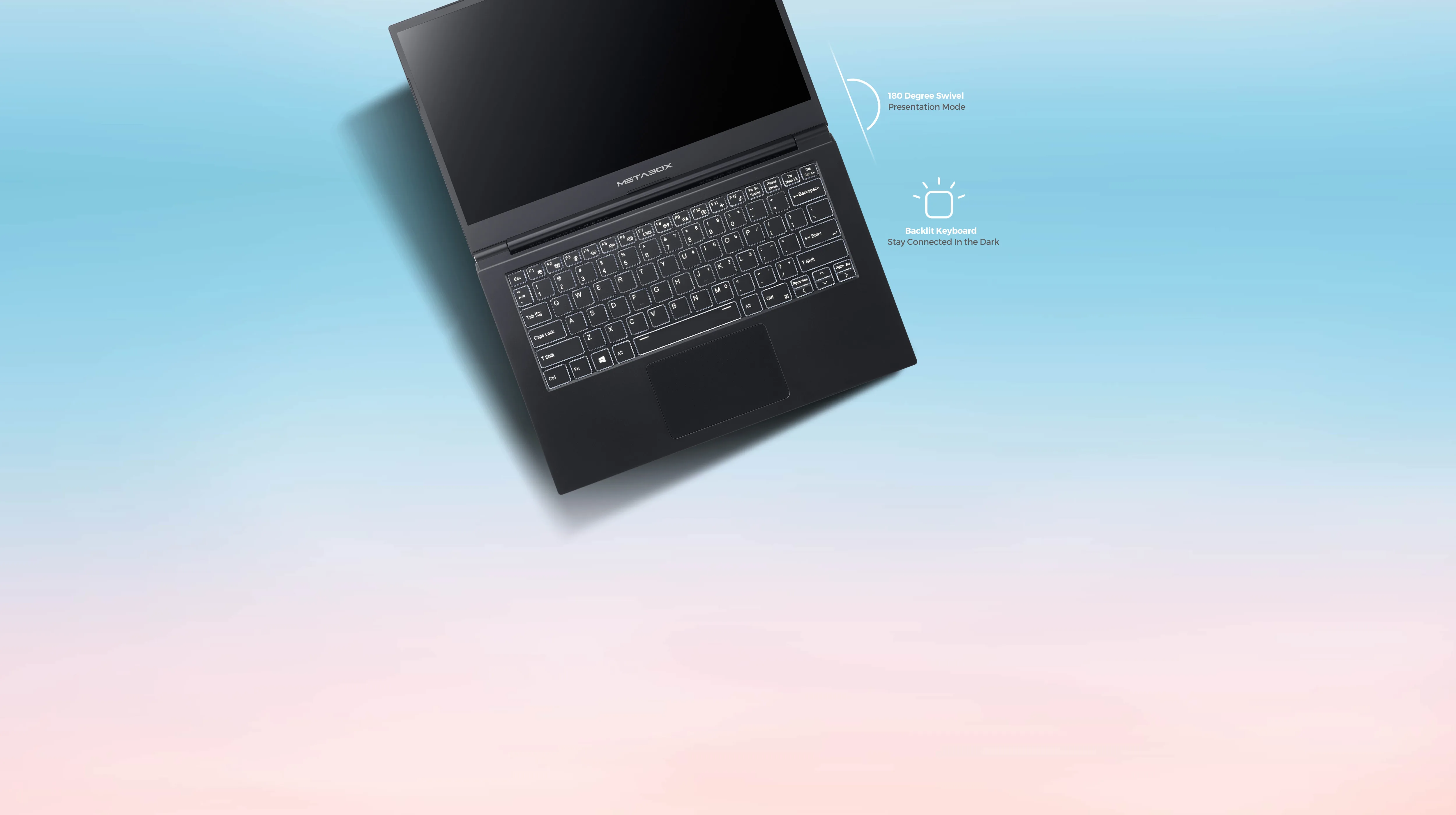 The Flo is a wonderfully small and compact device, yet it's so big on functionality. From a 180 Degree hinge swivel, that lets you present content when you're on the move, to a vibrant back-lit keyboard that guides your fingers when you work late into the night. Add to this a phenomenal level of customisability that allows you to configure the Flo into a desktop-like device and you might just forget the Flo is an ultra lightweight notebook.